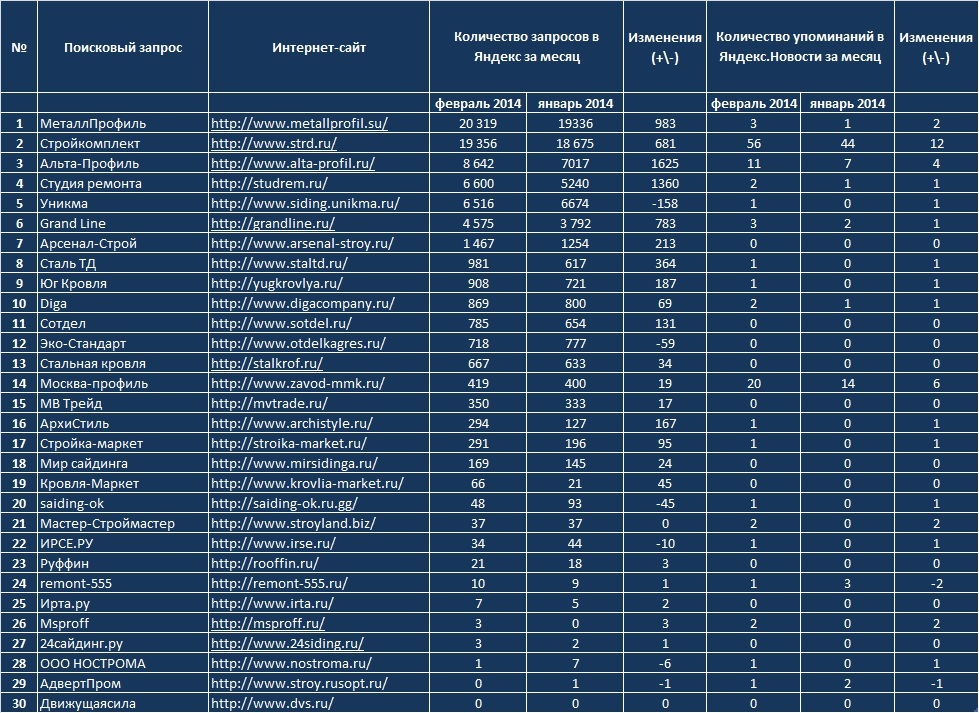 Общее количество запросов, которые были произведены жителями Российской Федерации по интернет-ресурсам, представленным в данном рейтинге, в феврале текущего года, составляет 74156. 65% из них пришлось на тройку лидеров, в то время, как компания «МеталлПрофиль», занявшая первую ступень рейтинга, взяла на себя 27%.