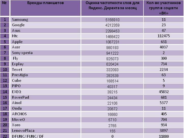 Аналитикам журнала «Биржевой лидер» сервис поисковой системы Яндекс также предоставил возможность определить точное количество запросов слов «бренды планшетов» в поисковой системе за последний месяц, которые были введены россиянами.