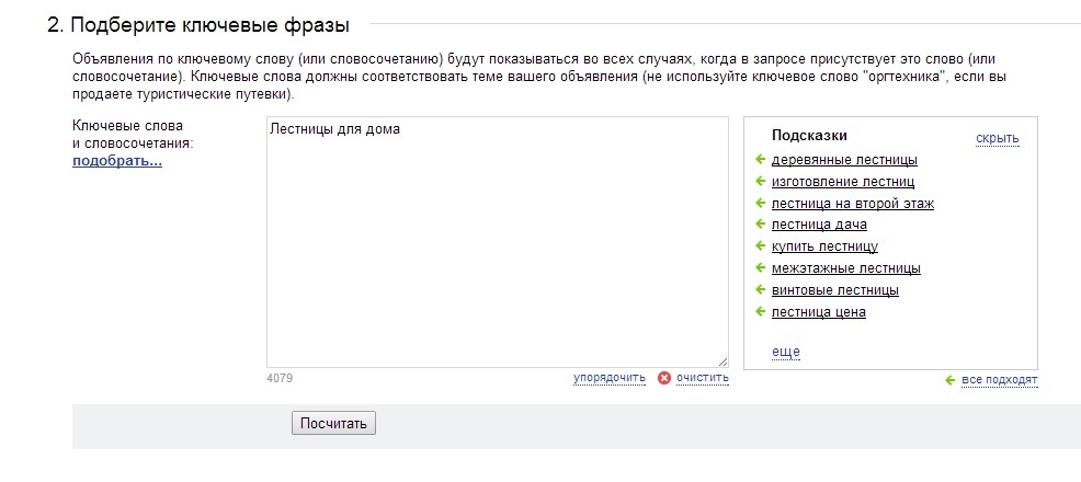 Согласно данным «Яндекс.Директ», наиболее популярными подсказками для правильного поиска интернет-ресурсов, продающих лестницы, являются: