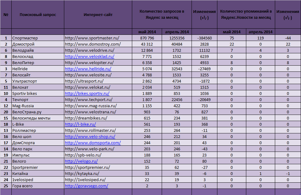 Рейтинг популярности интернет-магазинов, продающих велосипеды, в мае 2014 года.