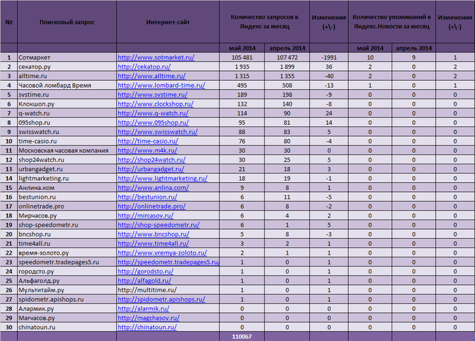Общее количество запросов в поисковой системе Яндекс, произведенных россиянами в мае текущего года по интернет-магазинам часов, принимающим участие в данном рейтинге, составляет 110 067. Около 99% от их числа приходится на тройку лидеров, в то время как около 96% пришлось на интернет-магазин "Сотмаркет", занимающий первую ступень.