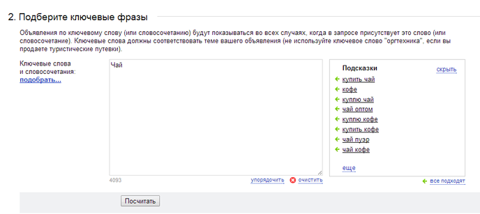 Сервис Яндекс.Директ предоставляет возможность проследить подсказки, вводя которые, пользователь поисковой системы Яндекс может найти подходящую для себя фирму, занимающуюся реализацией чая: