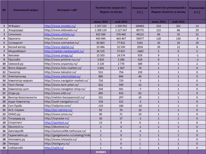 Общее количество запросов, произведенных по интернет-магазинам, вошедшим в данный рейтинг, составляет 3 838 683. 81% из них приходится на тройку лидеров, в то время как 34% взял на себя лидер рейтинга, магазин «М Видео».