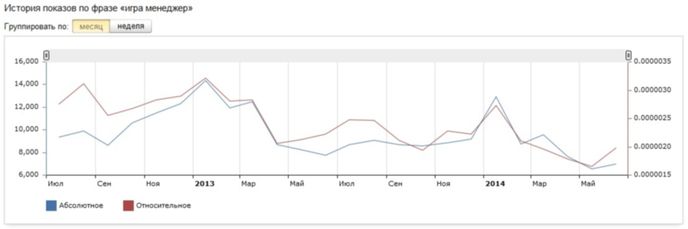 Приведенный ниже график отчетливо демонстрирует относительный рост популярности игр-менеджеров у пользователей России:
