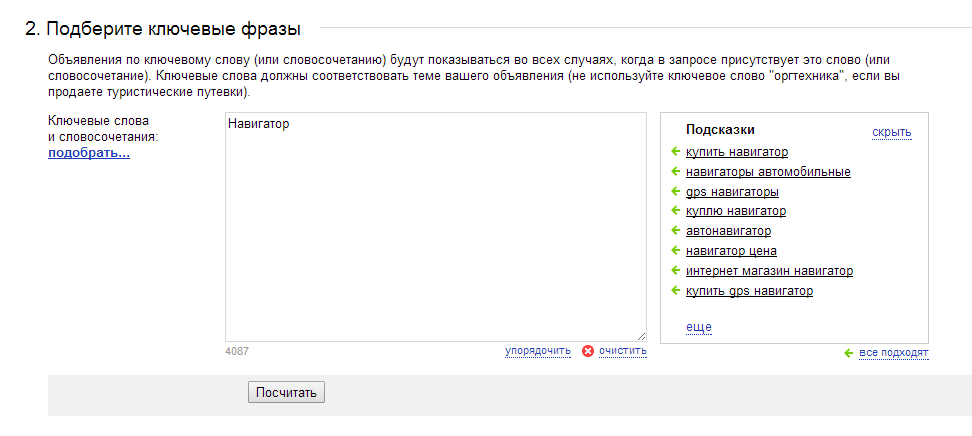 Сервис Яндекс.Директ предоставляет возможность проследить подсказки, вводя которые, пользователь поисковой системы Яндекс может найти подходящий для себя магазин по продаже навигаторов: