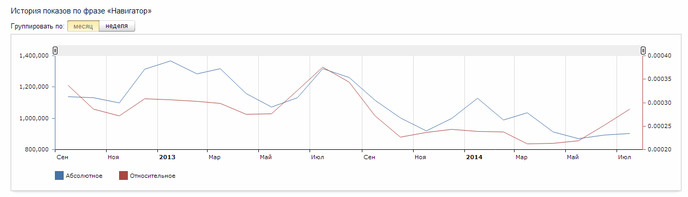 Также благодаря Яндекс.Директ аналитикам «Биржевого лидера» удалось проследить динамику запроса «навигатор» за последние два года: