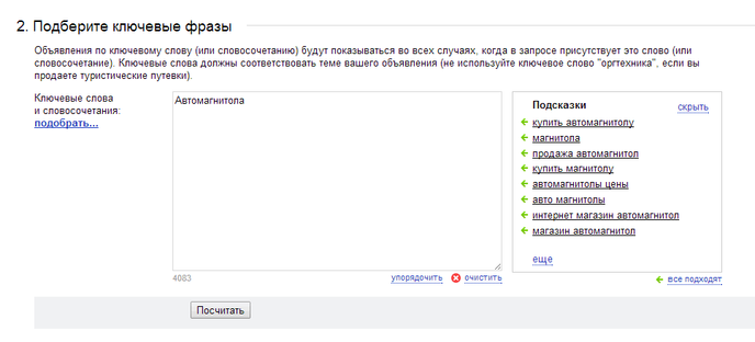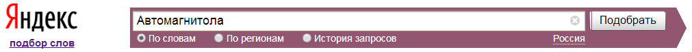 Сервис Яндекс.Директ предоставляет возможность проследить подсказки, вводя которые, пользователь поисковой системы Яндекс может найти подходящий для себя магазин по продаже автомагнитол: