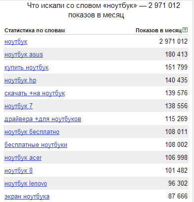 Как видно из фото, жители Российской Федерации интересовались запросом «ноутбук» в поисковой системе Яндекс 2 971 012 раз в августе текущего года.