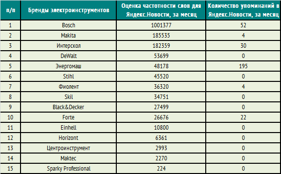 - частота упоминаний о брендах, рассчитанная при помощи агрегатора news.yandex.ru (Яндекс.Новости);