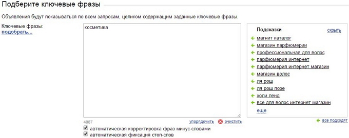 Сервис Яндекс.Директ предоставляет возможность проследить подсказки, вводя которые, пользователь поисковой системы Яндекс может найти подходящий для себя магазин по продаже косметики: