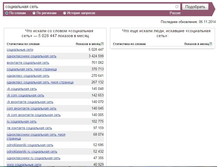 Сервис Яндекса wordstat.yandex.ru позволяет определить, что интересует россиян, когда они вводят в поиск Яндекса слова "социальная сеть".