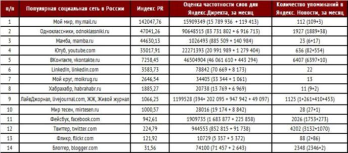 Рейтинг популярности социальных сетей у россиян.
