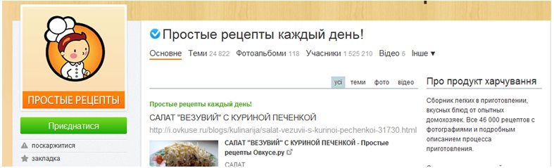 - также многие пользователи соцсети Одноклассники предпочитают знать о новых интересных рецептах, о чем свидетельствует высокая численность групп, посвященных кулинарным тематикам - простые рецепты каждый день! (1,5 миллионов участников).