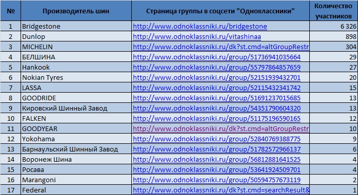 Для определения популярности фирм, производящих автомобильные шины, в социальной сети «Одноклассники.ру» самым оптимальным способом является составления рейтинга соответствующих тематических групп, путем определения количества их участников.