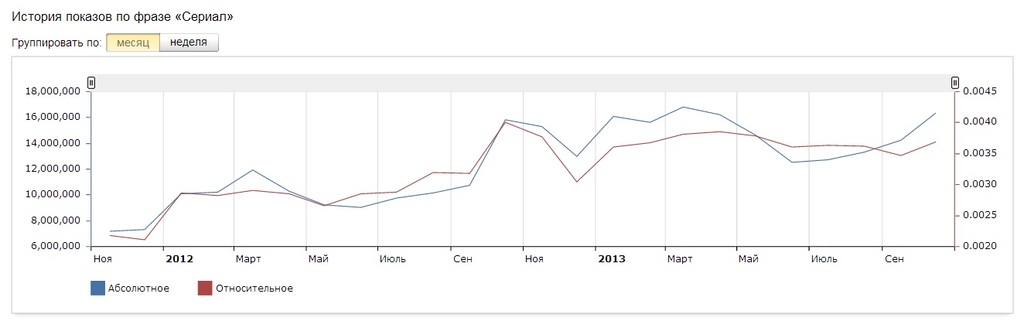 Также благодаря Яндекс.Директ аналитикам "Биржевого лидера" удалось проследить динамику запроса "сериалы" в период с ноября 2011 по ноябрь 2013 годов.