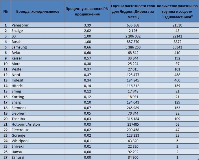 Для определения эффективности пиара брендов холодильников в сети Интернет аналитики "Биржевого лидера" просчитали соотношение количества участников в группе соцсети "Одноклассники", которые посвящены конкретным брендам, и количества запросов по ним в поисковой системе Яндекс за последний месяц.