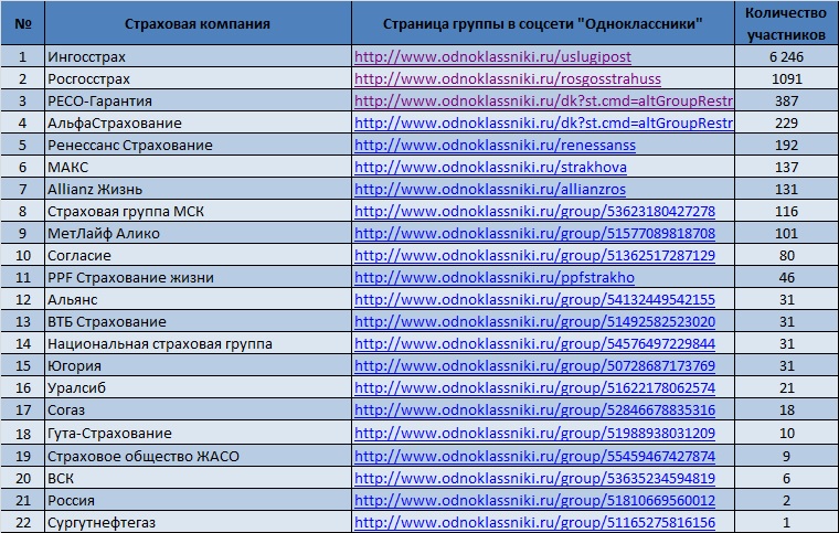 Для определения самых популярных страховых компаний среди пользователей социальной сети «Одноклассники», аналитики «Биржевого лидера» составили список групп, тематика которых посвящена одной конкретной страховой компании, после чего отсортировали его по количеству участников.