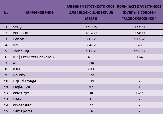 Для определения самого популярного бренда видеокамер в социальной сети «Одноклассники» аналитики «Биржевого лидера» сделали следующие: