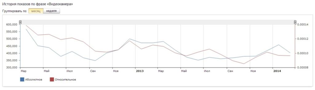 - самый низкий интерес к запросу «видеокамера» в поисковой системе Яндекс жители Российской Федерации проявляли в октябре-ноябре 2013 года (около 378 тысяч запросов);