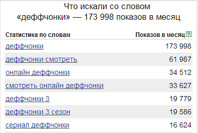 Как видно из фото, жители Российской Федерации интересовались сериалам «Деффчонки» в поисковой системе Яндекс 173 998 раз в мае текущего года.