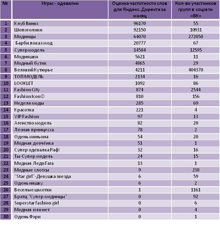 - составление рейтинга групп в соцсети «ВКонтакте», которые посвящены играм-одевалкам для девочек;