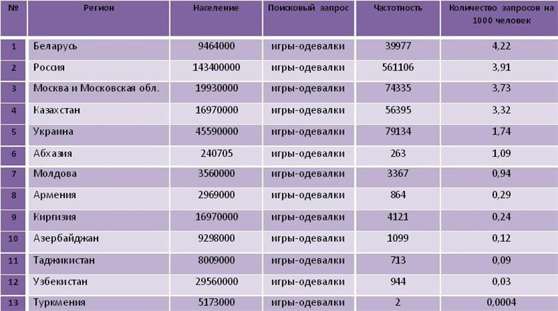 - запрос слов "игры-одевалки" за последний месяц чаще всего вводили жители Беларуси – 4,22 запроса на 1000 человек;