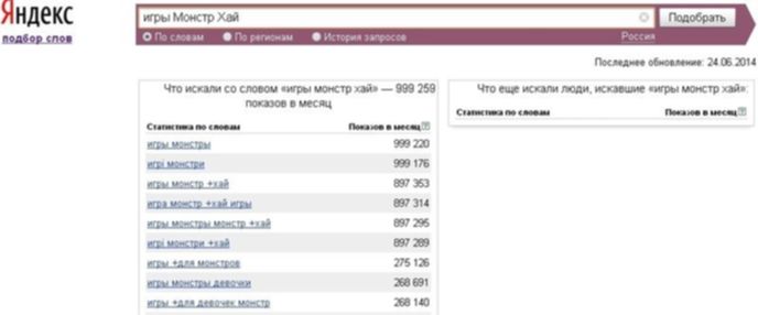 Представленная картинка показывает, что запрос «игры Монстр Хай» за прошлый месяц вводился 999259 раз россиянами в поисковой системе Яндекс.