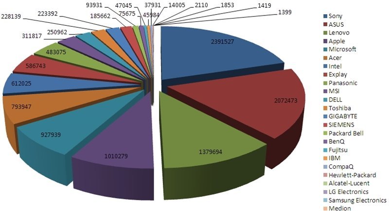 - На первом месте находится производитель компьютеров "Sony", которым россияне в прошлом месяце интересовались больше всего – 2391527 раз.