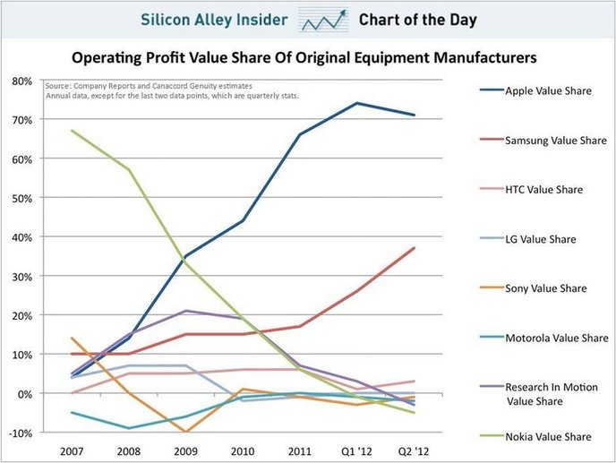 Всего две компании, Apple и Samsung, на данный момент просто "поглотили" весь рынок смартофонов: