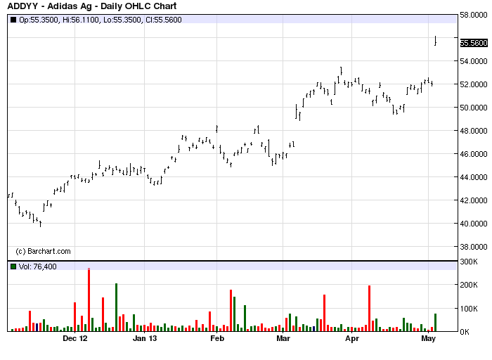 Спортивная компания Adidas AG в первом квартале 2013 года увеличила чистую прибыль на 6,5 процента – до 308 млн евро по сравнению с 289 млн евро за аналогичный период годом ранее. Выручка компании сократилась на 1,9 процента - до 3,75 млрд евро. В Западной Европе выручка упала на 6 процентов, в Китае выросла на 6 процентов, в Латинской Америке выросла на 12 процентов.