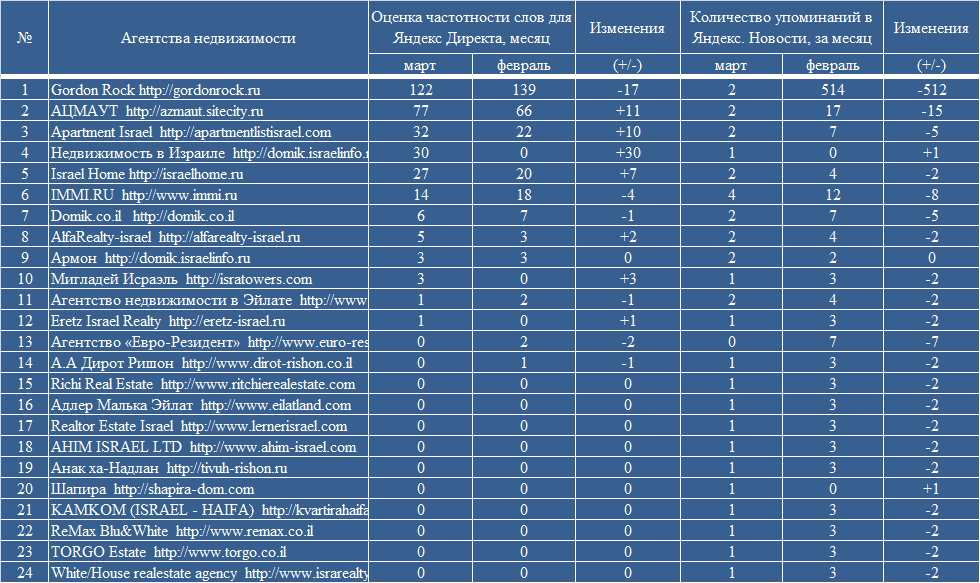 1. Семь компаний улучшили свои результаты по сравнению с предыдущим месяцем (29,17% участников рейтинга). Наилучшая динамика оказалась у АН «Недвижимость Израиля», занявшего 4 место по популярности в марте: