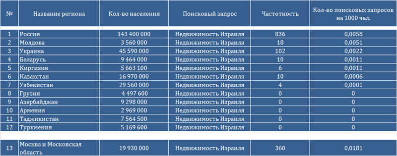 Из Грузии, Азербайджана, Армении, Таджикистана и Туркмении запросы по фразе «Недвижимость Израиля» в июле 2014 г. не вводились.