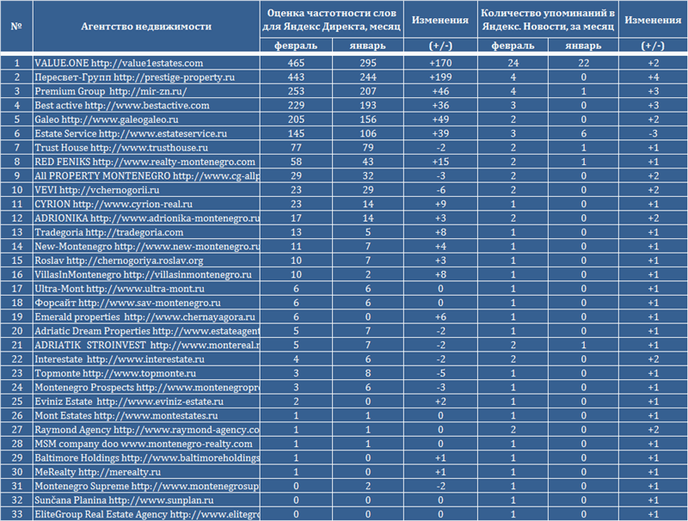 1. В феврале 2015 года лидером популярности в Рунете среди АН Черногории снова стала компания VALUE.ONE, получившая 465 запросов через поисковую систему Яндекс с территории России. По сравнению с предыдущим месяцем показатель вырос на 170 пунктов (+57,63%).