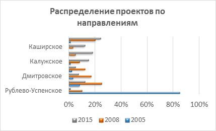 Среди популярности проживания в таунхаусах, размещенных поблизости от основных автомагистралей Подмосковья, интерес привлечен к Рублево-Успенскому шоссе, тогда как в других регионах наблюдается примерно равномерное распределение таунхаусов.