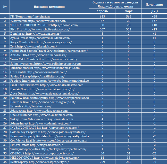 Общее количество запросов об участниках рейтинга в апреле составило 1653, что равняется 20,19% от количества запросов по фразе "Недвижимость Турции".