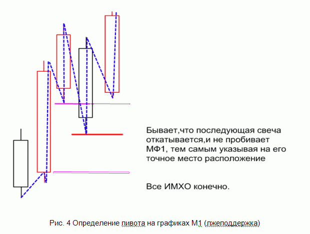 Ситуация третья - определяется уже после установления начальной линии поддержки. В основном, она так и остается единственной, но бывают и такие случаи, когда последующая свеча - т.е. третья, откатывается, но все-таки не пробивает ее. Эта ситуация, как ни странно, не является поводом сомневаться в данной методике, а наоборот, дает возможность максимально точно определить пивот (рис. 4).