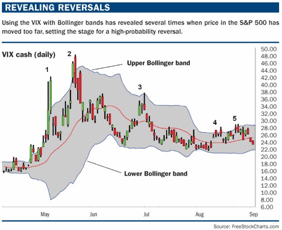 Лари Коннорс, глава Connors Research Group и автор книги “How The Stock Market Really Works” (Как на самом деле функционирует фондовый рынок) установил, что когда индикатор VIX достигает экстремальных значений на протяжении нескольких последующих дней, вероятность резкого разворота можно рассчитать с предельной точностью, что дает трейдеру весомое преимущество в торговле (см. рис. “Revealing reversals” (обнаруживая развороты)).