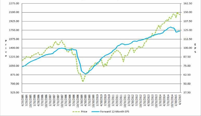 Рисунок 1. Изменение показателя прибыли на акцию (Forward 12-Month EPS) и стоимости (Price) акций за последние 10 лет