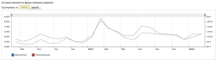 Популярность каждой клиники в отдельности напрямую зависит от общего количества запросов о клиниках Израиля. Исходя из статистики Яндекс.Директа, по данной ключевой фразе можно сделать вывод о резком увеличении интереса интернет-пользователей к этой теме в этом месяце.