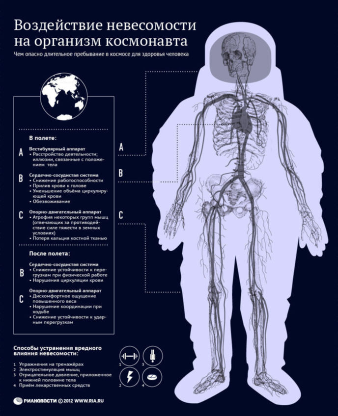 Космонавты, которые проводят в невесомости короткий период времени, жалуются на проблемы со зрением, при этом после возвращения на Землю они исчезают. Но если пребывание в космосе было длительным, зрение самостоятельно не восстанавливается.