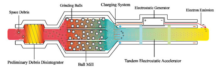 Главной проблемой для ученых было измельчение выловленного в космосе мусора до порошкообразного состояния, и для этого ими было предложено использовать вращающийся цилиндр с шариками – барабанно-шаровую мельницу, наподобие тех, которые применяются при изготовлении гипса, керамики и цемента. Полученный в результате работы мельницы порошок затем нагревается и помещается в систему, разделяющую электроны и ионы. Ионы, имеющие положительный заряд, помещаются в сильное электрическое поле, которое их ускоряет до высоких энергий. В итоге из сопла спутника, сообщая ему импульс, вылетают положительные ионы, причем выбрасываются вместе с легкими электронами, чтобы космический аппарат оставался электрически нейтральным.