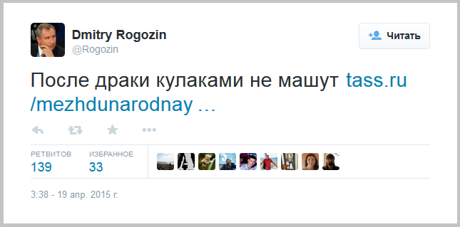 Примечательно то, что когда в норвежском обществе поднялась волна возмущения по поводу приезда Рогозина, его визит уже был завершен, территорию страны он покинул. В своем Twitter-акаунте ситуацию, возникшую в связи с его посещением архипелага, Рогозин прокомментировал фразой «После драки кулаками не машут».