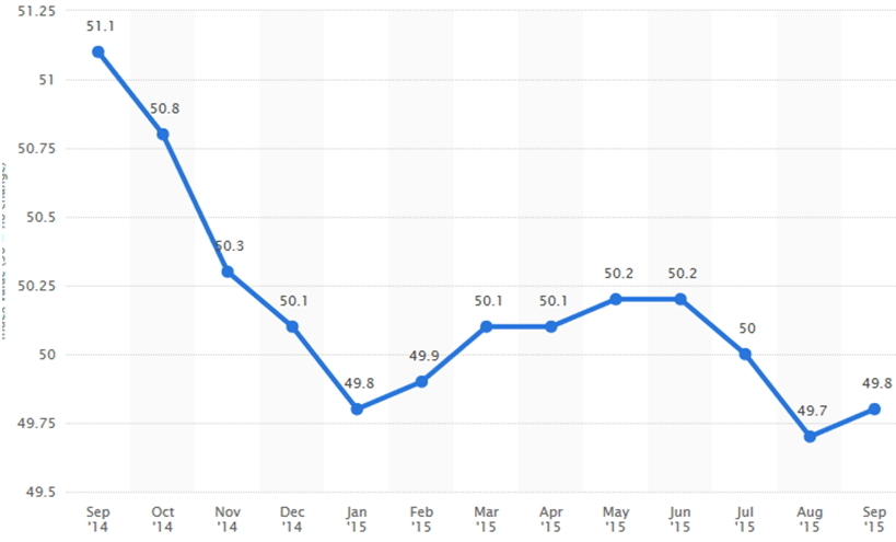Еще одним фактом подтверждающим наличие кризисных явлений в промышленности является то, что индекс деловой активности Китая (PMI) продолжает снижаться еще с прошлого года. Считается, что если он падает ниже 50 пунктов, то это говорит о снижении производственной активности, - отмечают аналитики факультета FTSE Академии Masterforex-V.