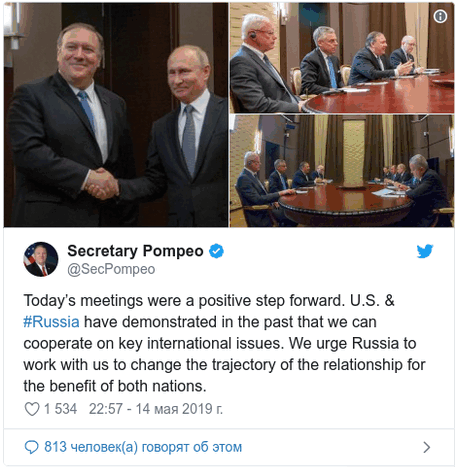 В своем Twitter госсекретарь США написал, что проведенные встречи стали «позитивным шагом вперед». В прошлом Россия и США, по его словам, показали, что могут взаимодействовать по ключевым вопросам международной повестки. Помпео призвал Россию сотрудничать с США, чтобы «изменить траекторию отношений на благо обеих наций».