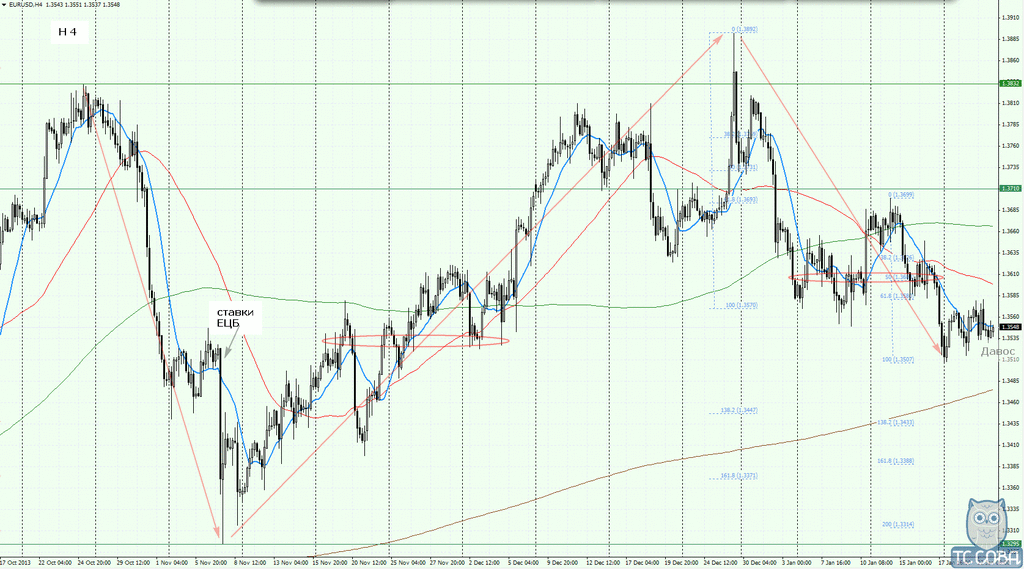 Таким образом, развитие движений с октября прошлого года можно охарактеризовать как спекулятивное, по сути, обозначен флет в широком диапазоне (около 600 пунктов), в котором происходит перераспределение объемов, интерес сосредоточен в диапазоне 1.3520-1.3605. С учетом продолжающихся расследований в отношении действий крупных банков по подозрению в сговоре и манипуляциях на валютном рынке, стоит ожидать после Давосских встреч возврата к соблюдению правил. Удалось ли элите достигнуть взаимопонимания или борьба будет продолжена, трейдеры увидят по закреплению цены выше или ниже обозначенных уровней. Закрепление под 1.3520 и коричневой средней покажет, что доллар стремится укрепиться по отношению к евро, и наоборот, прорыв выше 1.3605 и закрепление выше зеленой средней обозначит укрепление евро относительно доллара.
