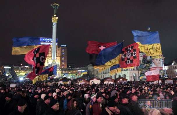 В Киеве же, в ходе шествия протестующих от парка Тараса Шевченко, в колонну активистов Евромайдана попыталась влиться группа людей весьма нестандартного внешнего вида, с одинаковыми знаменами цвета радуги и несколькими оранжевыми плакатами, надписи на которых гласили: «Кличко за Евро — гомо-майдан!».
