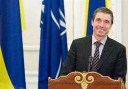 Отвечая на вопрос о членстве Украины в Альянсе, Андерс фог Расмуссен заявил, что это должно быть исключительно украинское решение. Так же он подтвердил, что это не является неотложным приоритетом нового правительства. И добавил, что Альянс помнит все решения, принятые на саммите НАТО в Бухаресте в 2008 году, и что Украина может стать членом НАТО в случае, если она соответствует определенным критериям и имеет желание вступить. По его мнению, на данном этапе Украина должна решать более насущные сейчас для нее проблемы. Так же он заверил, что страны-члены НАТО готовы продолжать сотрудничать с украинской стороной.