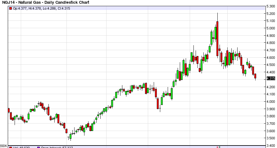 В условиях обострения ситуации РФ и Европы, цена фьючерса газа Natural Gas April 2014 (NGJ14) на бирже торгуется в нисходящем (медвежьем) тренде на уровне 4,315 долларов США.