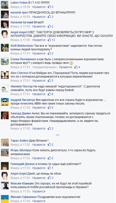 Пользователи поддерживают инициативу введения неприкосновенности для журналистов, однако отмечают, что этой возможностью могут воспользоваться и те представители средств массовой информации, которые используют свою работу для распространения лживых ведомостей.