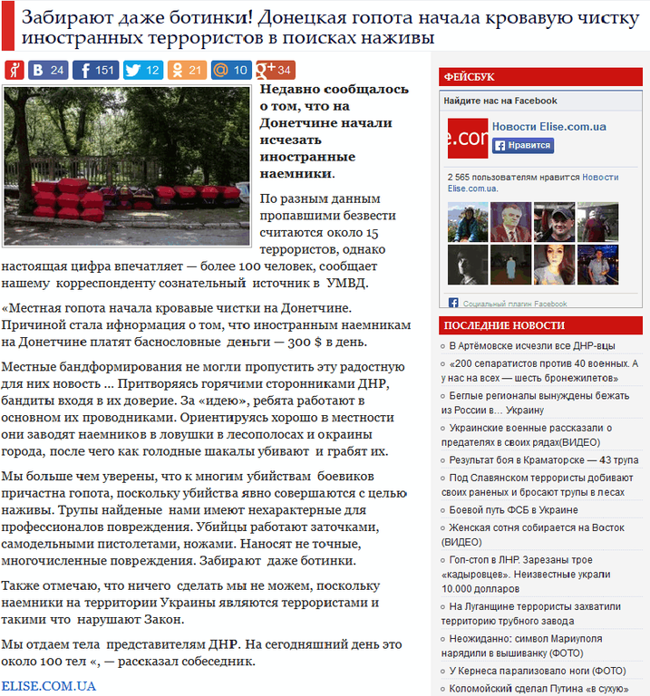 Причиной «пристального внимания» к боевикам самопровозглашенной республики стала информация о том, что иностранные наемники за день своей «работы» получают по 300 долларов - немалые деньги для предприимчивых «гопников». Для получения зарплаты иностранных наемников в свое безраздельное владение расторопные местные парни притворяются ярыми сторонниками ДНР, втираются в доверие и предлагают свои услуги в качестве проводников. Полупрофессиональные проводники хорошо знают все глухие закоулки в родных местах. Впоследствии в этих самых закоулках трупы иностранных боевиков и обнаруживаются сотрудниками правоохранительных органов.